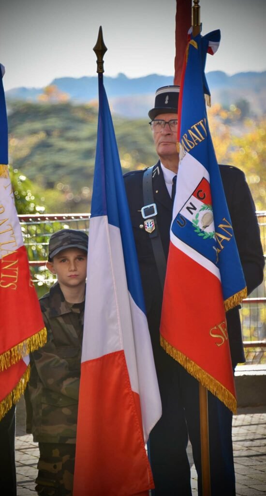 Un petit garçon portait fièrement notre drapeau, encadré par ceux qui ont servi.
